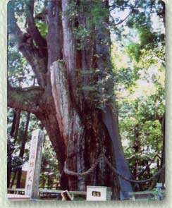 | 日本一の大杉として名高い「杉の大杉」は、最古の昔に須佐之男命(すさのおみこと)が植えられたと伝えられる推定樹齢3000年の巨木です。 この「杉の大杉」は、それぞれ南大杉、北大杉と呼ばれる二株の大杉からなっており、二株が根元で合着していることから、別名、夫婦杉とも呼ばれています。 南大杉は根元の周囲が約20メートル、樹高が約60メートルで、北大杉は根元の周囲が約16.5メートル、樹高が約57メートルあり、昭和27年に国の特別天然記念物に指定されました。 |
