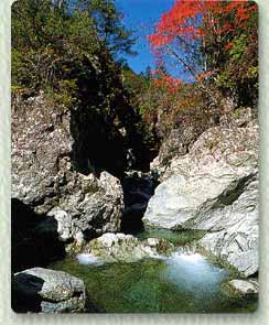 奥大田渓谷は吉野川の支流、奥大田川の上流部にあります。切り立った渓谷の水は澄みきり、清冽な流れの水音が耳をくすぐります。四季を通じて心地よい風が吹きわたりますが、なかでも秋の紅葉は見事!燃え立つような赤が川面に映え、樹木との二重の美しさで訪れる人々を魅了します。 近年までは地元の人たちだけが知る秘蔵のスポットでしたが、噂が噂を呼んで年々訪れる人が増え、今ではビュー・ポイントに休憩所も設けられています。 |